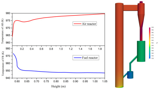 The distribution of temperature in both AR and FR is shown in Figure 6. In AR, the oxygen carrier reacts with oxygen, which is an exothermic process. In FR, the reduction of the oxygen carrier is an endothermic process. As shown in Figure 6, the temperature in AR is low at the bottom due to the injection of air with a low temperature. Then, the temperature increases because of the heat transfer between oxygen carrier and gas phase. The decrease in temperature at a height of 0.3 m is caused by the inlet of the loop seal, where the cold gas and particles are injected into the air reactor. Then, temperature keeps increasing due to the reaction heat releasing during the oxidation process of oxygen carrier. At the bottom of FR, the temperature is high because oxygen carriers from the air reactor with high temperature enter FR. The temperature decreases with height and it is nearly constant (957K) at the end of the reactor. The distribution of temperature in the system is consistent with the theoretical analysis. We get a similar trend of temperature as in the work of Want et al. [17] on a CLC simulation.