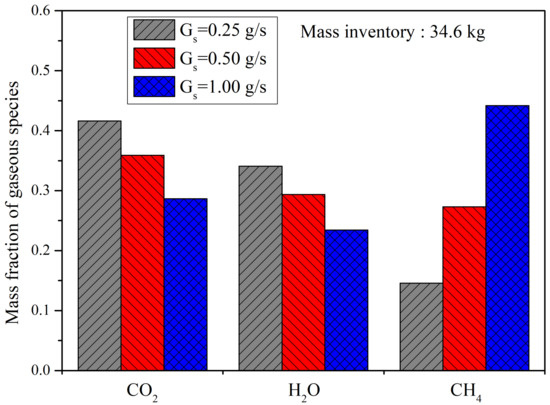 The influence of the inlet rate of methane is tested, which corresponds to the CO capture capacity of the system. The mass fraction of gaseous species at the outlet of the FR are shown in Figure 8 for three cases with an inlet rate of 0.25 g/s, 0.5 g/s and 1.0 g/s. The CO fraction decreases with the methane inlet rate and the same tendency for the water vapour. Additionally, more methane is found at the FR outlet, because of the short contact time between gas and oxygen carrier. The corresponding distribution of gas species is illustrated in Figure 9. It shows intuitively the variety of the product and reactant with inlet rate. We can find CO in the loop seal and air reactor, which is caused by the leakage and is quite low in this work. The results are consistent with the work of Johansson [33].