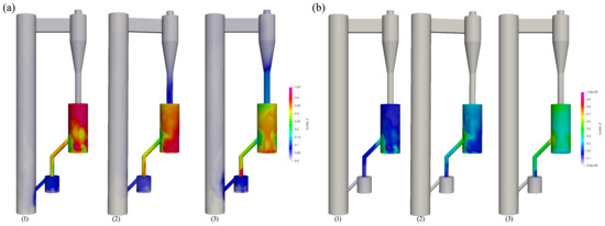 Instantaneous distribution of gas species with different inlet rate of methane. (a) CO2. (b) CH4. (1) 0.25 g/s. (2) 0.5 g/s. (3) 1.0 g/s.