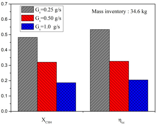 From Figure 10, the conversion rate decreases with the methane injection rate, also less methane is converted into CO under current conditions. The resistance time decreases when increasing the FR inlet rate. Under current conditions, the operating temperature of FR is about 940 K and the total mass inventory is 34.6 kg, it is hard for the system to convert more methane and most of it escapes the reactor. The capture efficiency is quite low with a high inlet rate of methane. One possible solution is to increase the inventory or the operating temperature.