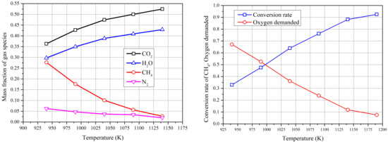 The performance of the CLC system under different temperatures is analysed in this section. As shown in Figure 11, the mass fraction of CH at the FR outlet decreases with temperature, which is due to the kinetic reaction increasing with temperature. More products, CO and HO, are generated simultaneously. The nitrogen is also detected at FR outlet, which is from the loop seal. The conversion of fuel is an important parameter to assess the CLC performance. As shown on the right of Figure 11, the conversion rate of methane increases from 0.33 to 0.92 when raising the operating temperature from 930 K to 1290 K. The relationship is approximately linear, with a slope of 0.0024 per Kelvin. The oxygen demanded is the fraction of O required to fully burn the fuel and O needed by the unconverted gas exiting FR [38]. The similar effect of temperature has been presented in the work of Liu et al. [39]. From the figure, the oxygen demanded decreases with temperature, because more methane has been converted in FR with a higher temperature. Under current conditions, high operating temperature is beneficial for improving the performance of system.