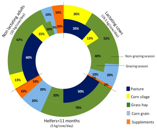 To capture the differences of farm management, a small organic dairy farm, representative of Wisconsin, was modeled based on data provided by the Cooperative Regions of Organic Producers Pools (CROPP), marketed as Organic Valley (OV), the largest organic dairy cooperative in the U.S. Farm characteristics. Data about herd management, milk production, crop production, energy use, manure, and cropping management for each farm type and region were provided by OV and compiled through internal surveys, and interviews with farmers, in-house veterinarians, and feed specialists. The small dairy farm is composed of 150 lactating Holstein cows, 38 mature heifers and dry cows, 78 growing heifers, and 8 calves. The daily milk production is 22.7 kg, at 4.2% fat and 3.1% protein, with the dairy ration presented in Figure 2. This farm maximizes grazing, which occurs for 6 months (May to October). Crop production areas receive manure as the only nitrogen and P fertilizer source, with some crops supplemented with potassium, gypsum, lime, and micronutrients. Cows are housed in a free stall. Manure is handled in its slurry form and stored for 6 months before land application in spring and fall. It is assumed that 90% of manure is collected during the non-grazing season and 50% of manure is collected during the grazing season.
