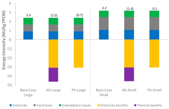 Net Energy Intensity (NEI) from the base-case large and small dairy farms (no renewable energy production), the same farms with AD systems (including solid-liquid separation), and the same farms with solar PV systems producing the same electricity than the corresponding AD system.
