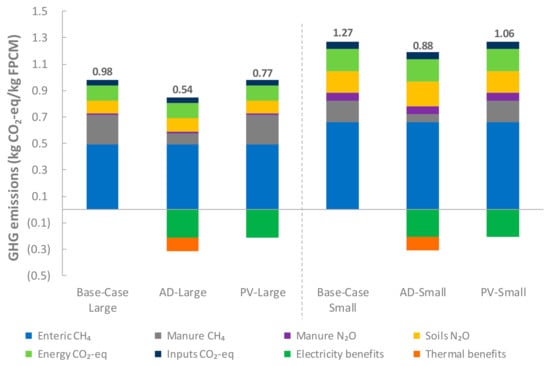 GHG emissions from the base-case large and small dairy farms (no renewable energy production), the same farms with AD systems (including solid-liquid separation), and the same farms with solar PV systems producing the same electricity than the corresponding AD system.