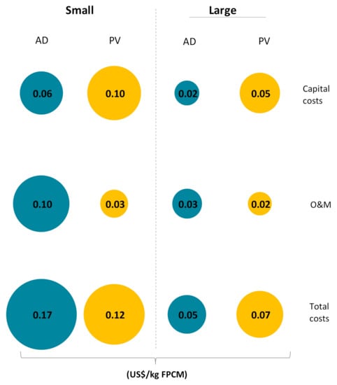 Contrary to the large base-case farm, a comparison of the annualized costs for the small base-case farm shows that the PV system is more competitive than the AD system for electricity production (Table 3). This is explained by the economies of the scale of AD systems that justify the installation of large digestors at dairy farms (generally processing manure from >1000 cows). On the other hand, solar PV systems are more flexible and modular, allowing lower investment costs for smaller systems. In addition, solar PV systems have lower O&M costs and longer lifespans than AD systems, which is reflected in the annualized cost estimations.