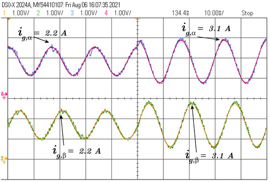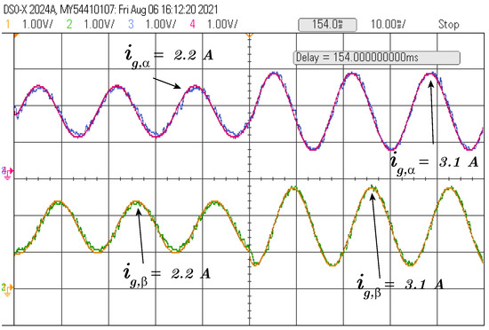 Step test for current () and the reference.The purple line is the alpha current reference and the blue line is the alpha grid current signal. The yellow line is the beta current reference and the green line is the beta grid current signal.