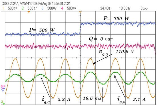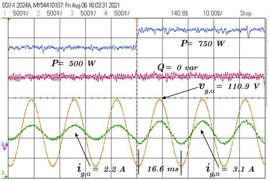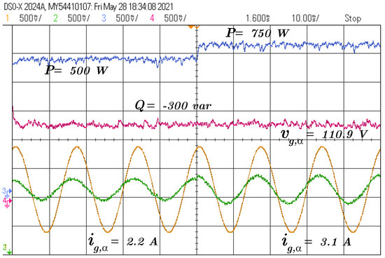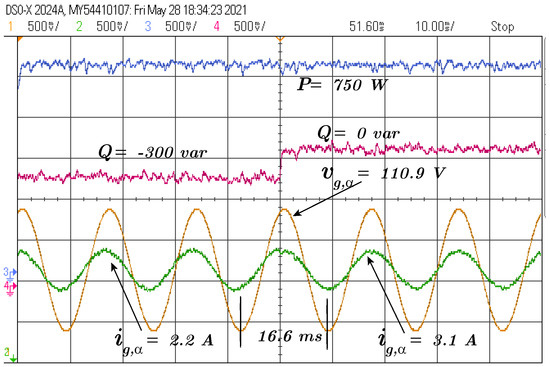 The following test is a step of reactive power reference from var to 0 var, and the active power reference is maintained at 750 W, as depicted in Figure 6.