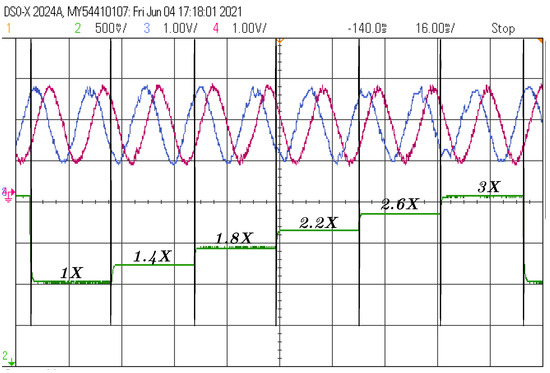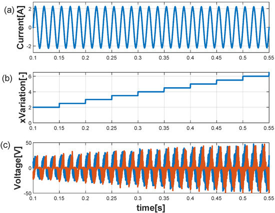 This subsection presents the experimental test for parameter variation. The test consists of the parameter change from to in five steps, increasing in each step. Figure 7 depicts the () current under parameter variation.