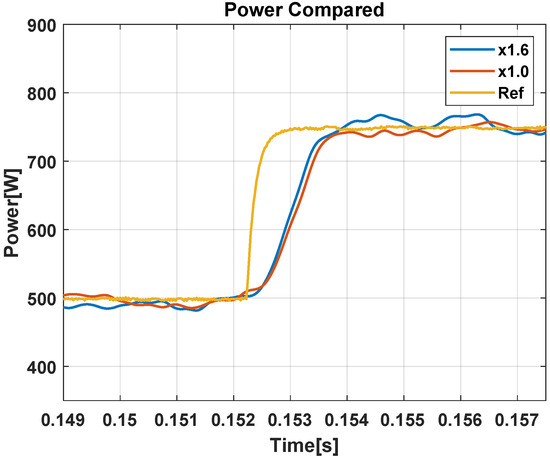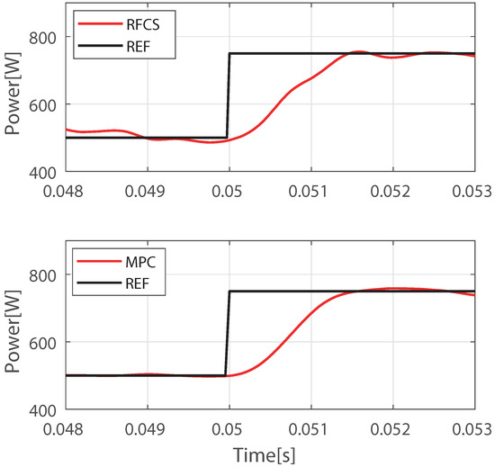 Notice that in both cases the rise time is approximately ms. This value of dynamic response is considered good when compared to the same dynamic response presented in [30]. The only visible difference is in the fact that there is a different minimum stationary error in the two cases due to the variation of the parameters, but still not enough to affect the system performance. The result supports the idea that the proposed controller is capable of maintaining the system dynamic response even under parameter variation. Figure 12 presents the dynamic response from the CSV data obtained through the test bench for MPC and the RFCS to illustrate the performance for both controllers. For the same test conditions, the RFCS achieved ms and the MPC ms, which demonstrates the acceptable dynamic response for the proposed controller.