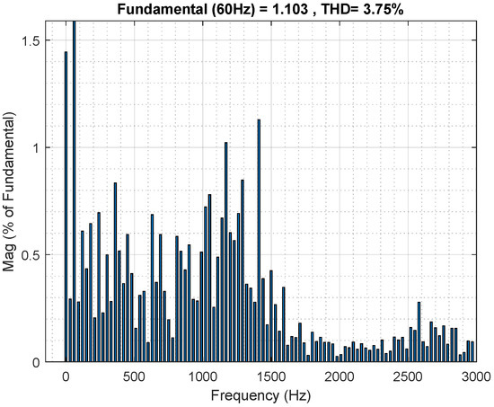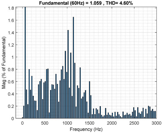 The THD result for the current is , in accordance with the grid requirements of IEEE Std 1547.2-2008 [24], for which it is necessary to be below . The next THD analysis is for the current with the system under parameter variation, for which the resistance and inductance were increased in , presented in Figure 15.