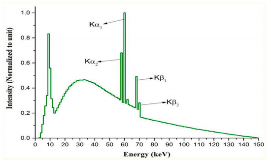 The simulation setup includes an X-ray tube, a pipe, and a NaI detector (Figure 1) and was conducted through MCNPX code [28]. A normal industrial X-ray tube was applied in this study. The electron source and a tungsten/rubidium target are embedded in X-ray tubes as the cathode and anode, respectively. Likewise, the shields with an output window, as well as a filter against the output window, are utilized. A perfect X-ray tube simulation by MCNPX code is time-demanding, in which an emitted electron from the cathode responds to the anode and generates an X-ray emission. Since the calculation of photons passing MCNPX code is lower than the electron, in this study, a source of photons mounted in an X-ray tube’s shield was considered for a cathode–anode collection. TASMIC, a free package proposed by Hernandez et al. [29], was utilized. It is worth noting that numerous investigations have been performed on X-ray spectra generation by both theoretical and MCNP techniques [30,31]. Figure 2 indicates the normalized conducted X-ray spectrum, as well as the characteristics of X-ray peaks in relevance to the tungsten target (Kα1, Kα2, Kβ1, and Kβ2). The previously mentioned photon source was embedded in a cylinder serving as an X-ray tube layer. The circular profile on the X-ray tube acting as the output window is 5 cm. It is highly important to mention that the cylindrical shape commonly constitutes the X-ray tube shields made up of lead or steel to prevent the converse radiation diffusions generated by X-ray. On the shield surface, a section is left open, as the output window, in order to release the congenial generated X-ray photons. To filter low-energy photons in this research, an aluminum filter having a thickness of 2.5 mm was mounted against the output window.