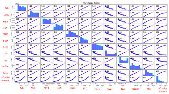 One of the most important challenges of this research is to determine the most effective characteristic for determining the volume ratio of each oil product. Correlation analysis was used for this purpose. The result of the correlation analysis between the extracted characteristics is shown in Figure 3. As shown in this figure, many features are very similar to each other, and their selection as the network input is ineffective. However, the characteristics of the fourth-order moment, skewness, and kurtosis are the least similar to each other, so these characteristics have been selected as the input of the neural network.