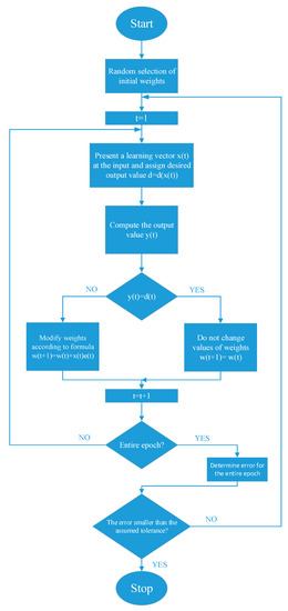 Therefore, the perceptron can be considered as a hyperplane in the n-dimensional space of the samples. Perceptron sets a value of 1 for samples on one side of the page and −1 for values on the other side of the screen and can only learn examples that are linearly separable. Such examples are cases that can be completely separated by a hyperplane. The purpose of training a perceptron is to find the values of its weights, so that the perceptron generates the correct values for the training examples. Different kinds of numerical calculations [68,69,70,71,72,73,74,75,76,77,78] and soft computing [79,80,81,82,83,84,85,86] have been used in various fields such as electrical engineering problems [87,88,89,90,91,92,93,94,95,96,97,98,99,100,101,102], computer sciences problems [103,104], and basic sciences [105,106,107,108,109], etc. In this paper, the perceptron learning algorithm is as follows—this algorithm is shown in Figure 4 as a flowchart: