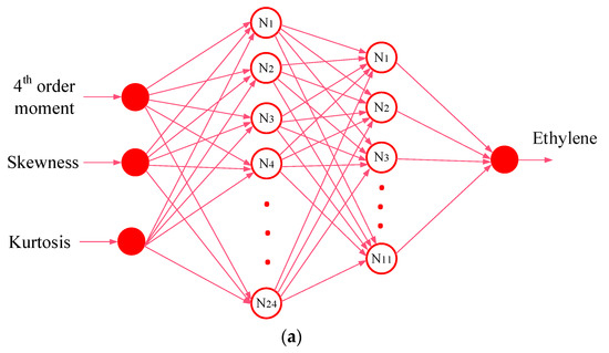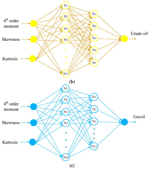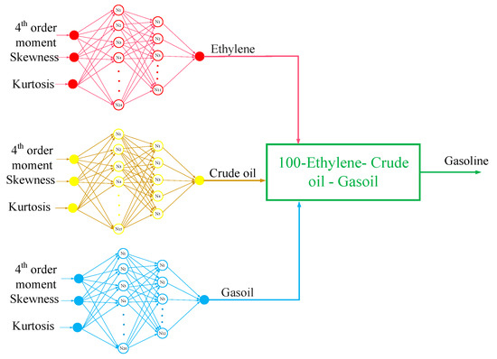 In this study, the characteristics selected using correlation analysis were used as neural network inputs to determine the volume ratio. Three artificial neural networks were established to predict the volume ratios of ethylene glycol, crude oil, and gasoil. The structure of these networks is shown in Figure 5. By recognizing the volume ratio of the three given products, the ratio of the fourth product, i.e., gasoline, can be feasibly estimated. The features of the designed networks are visible in Table 1.