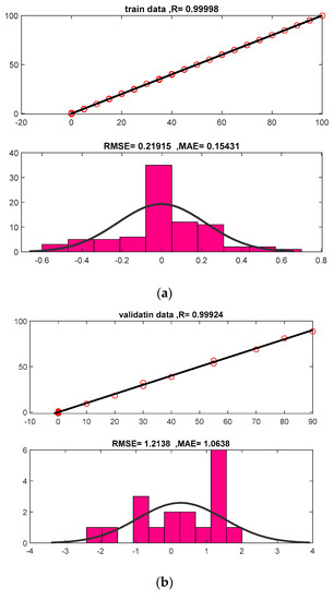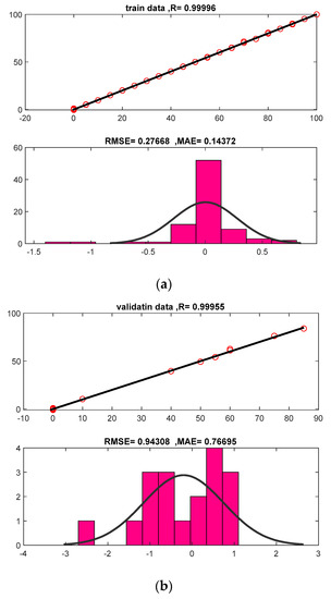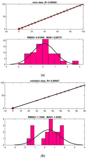 Regression and error histogram diagrams in relevance to training, validation, and test data are obvious in Figure 6, Figure 7 and Figure 8 to display the precision of the designated networks. Regarding these three figures, in the regression diagram, the closer the red circles (representing the network output) to the black line (representing the target output), the higher the accuracy of the designed network. The error histogram plot also clearly shows the scatter of error between the desired output and the network output. The most prominent scale for assessing the operation of artificial neural networks is prediction precision. Some of the most significant prediction precision criteria calculated in this study are: