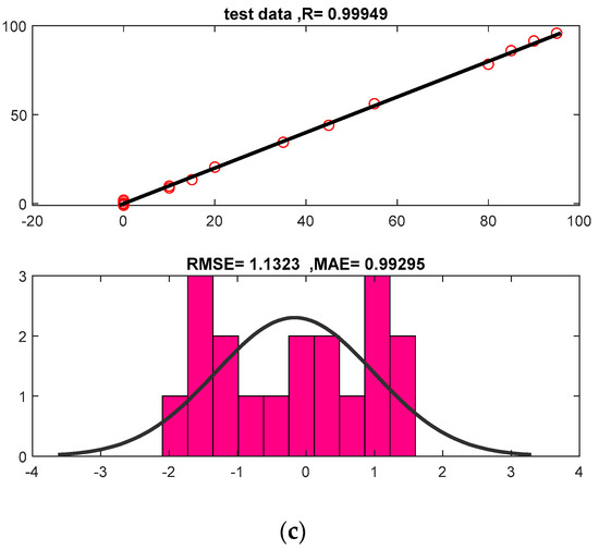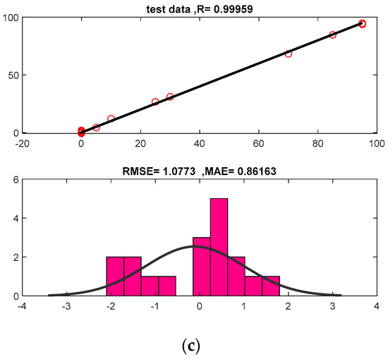 Operation of the designed neural network to recognize the volumetric ratio of ethylene glycol (a) train data, (b) validation data, and (c) test data.