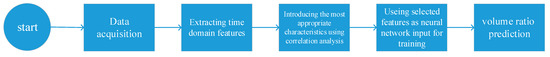 The amount of these calculated errors for all three implemented networks and for training, validation and test data is shown in Table 2. The volume ratio of three products, namely ethylene glycol, crude oil, and gasoil, were obtained using an artificial neural network. The volume percentage of the fourth product (gasoline) can be easily calculated by subtracting the volume percentage of the three products from 100% of the pipe volume, which is shown graphically in Figure 9. The general process of the article to determine the percentage of volume ratios can be seen in Figure 10. The steps of determining the volume ratio include data acquisition, extracting time-domain features, introducing the most appropriate characteristics using correlation analysis, using selected features as neural network input for training, and finally, volume ratio prediction.
