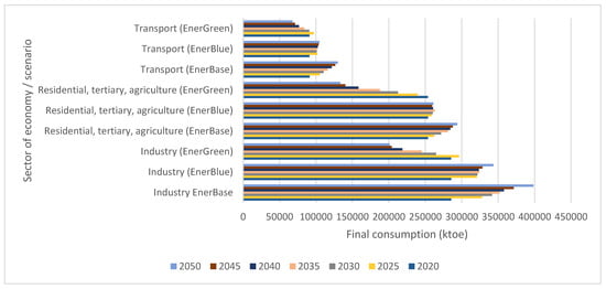 Total final energy consumption in the CIS countries by sector, ktoe. Notes: Other sectors’ final consumption is insignificant and constitutes 0.00–0.02 in 2030–2050 in all scenarios. Source: based on data from [30].