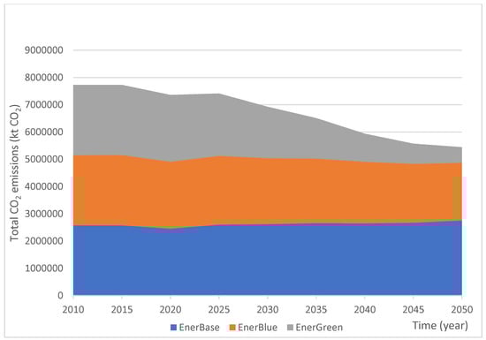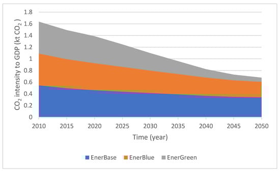 One of the significant limitations for CO2 and corresponding energy consumption decrease in developing countries is a corresponding limit to economic (DGP) growth. Empirical evidence from countries around the globe suggests that other factors being constant a 1% increase in GDP per capita is, on average, associated with a 1% increase in CO2 per capita [50]. This is also true for studies about countries in this region [51]. Figure 5 shows CO2 intensity to GDP in the CIS member states will decrease significantly in EnerBlue and even more in EnerGreen scenario.