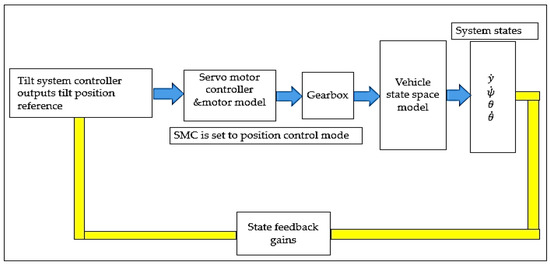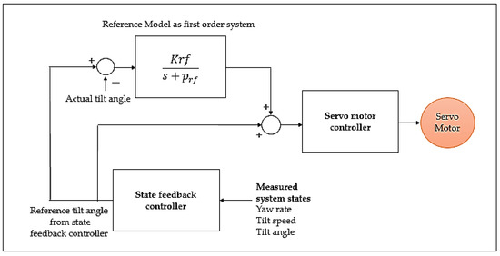 Regarding the controller type, a proportional derivative (PD) controller was proposed in [1,3,9], and a receding horizon controller (RHC), i.e., model predictive controller (MPC), was proposed in [6]. The RHC proposed in [6] aims to start tilting before the cornering begins. In this way, actuator torque and perceived acceleration can be reduced. In [8], a PD controller with a prefilter on control reference was proposed; In [10], a PID control including tilt position and tilt rate control was proposed. In [15], LQR/LQG control with state feedback, in [16] H2 optimal control with state feedback was studied and detailed mathematical analysis was given with simulation results. In [16], lateral speed, yaw rate, tilt speed, tilt position are given as system states and steering input is also included to calculate the tilt control reference.