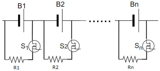 The commonly used PEC architecture [28] is shown in Figure 1. The advantages of PEC are that it is very simple, easy to apply and low cost, and all switches () and discharge resistors () are placed on the BMS circuit board (where i = 1, 2, …, n). Therefore, the temperature of BMS board will increase a great deal when performing the cell balancing. In most commercial products, the typically balancing resistor is 33 Ω [39], and the current of each channel is around 100~127 mA which maps to 3.3~4.2 V and the waste heat of the PEC is around 0.3~0.5 W per channel in the BMS board. To avoid overheating the BMS board, the BMS also limits the number of balanced channels.
