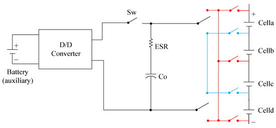 Figure 4 shows another implementation of the AEC with a single switched capacitor (SSC) with DC/DC converter principle, and the switches in Figure 4 also need high-speed switching to transfer energy between the auxiliary battery, capacitor, and string cells.