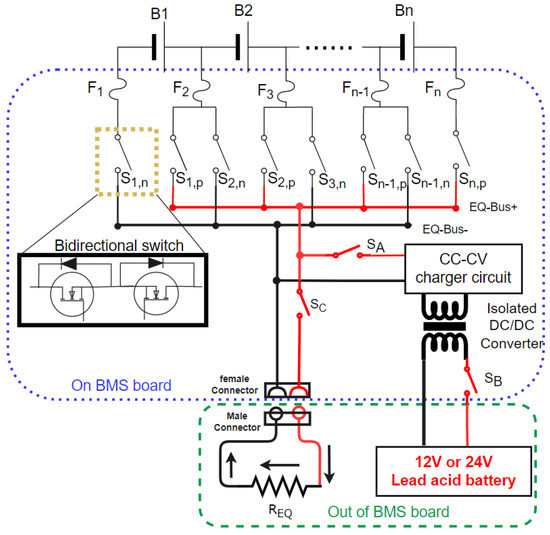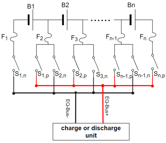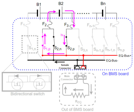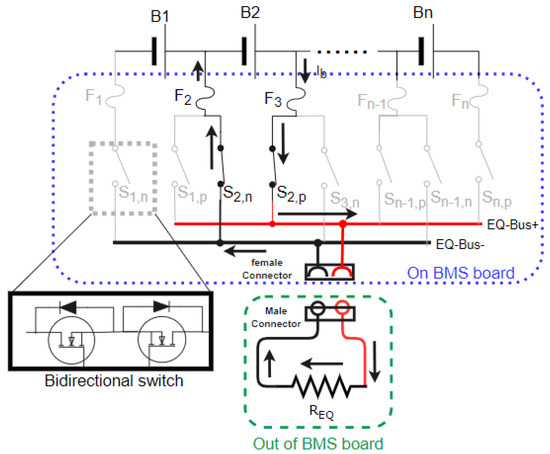 Figure 7 is an example to illustrate the principle of P-HEC. To discharge the B2 cell through the EQ-Bus, the BMS controls the and switches to be conducting. A discharge unit can be a fan or a heater to regulate the battery temperature or be a power resistor to dissipate the cell energy as conventional ones. The is installed out of the BMS board with proper cooling to prevent the BMS board temperature rising quickly when executing the balance operation. The cell balancing current () is related to the resistance of , conducting resistance of and , and the resistance of all connected parts from B2+ to B2−. For example, the is 1 Ω and the resistance of the BSs and wires is 0.5 Ω so that the total resistance is 1.5 Ω. The balancing current is 2.27 A ( = 3.4 V) to 2.8 A ( = 4.2 V) within cell operation voltage range. The fuse and switch specification will be calculated after given . When the HEC is only used as PEC, it allows the opposite electrode of EQ-Bus. Therefore, the switches and can be replaced with a single switch to save costs.