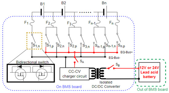 In general, the BMS is composed of measurement, communication, calculation, memory, equalization units, etc. The equalization unit is also called the cell balancing unit. The equalization unit is composed of two parts: an equalization control strategy [23,24,25,26,27,28,29] and an equalization circuit (EC) [28,29,31,32,33,34]. Its purpose is to reduce the maximum and minimum cell voltage differences of the battery pack to avoid battery overcharge and overdischarge, which can improve the safety and lifespan. Besides, the low cell voltage difference also increases the available capacity of the battery pack. Therefore, the equalization unit is the most crucial part of all BMS units. Retired vehicle lithium battery packs with good cell balance can be reused in energy storage systems for secondary use to produce huge economic and environmental benefits. Various ECs have been proposed in the past, which can be divided into two types: (1) the passive equalizer circuit (PEC) [28], also called dissipative balance, discharges the energy with a power resistor to the series-connected cell with the highest voltage, and (2) the active equalizer circuit (AEC) [27,28,29,30,31,32,33,34,36,37,38], also called non-dissipative balance, charges the energy to the cell with the lowest voltage. Many review articles have provided a detailed summary or comparison for the equalization design [17,26,28,30,32,33,36]. Therefore, the following summary is more focused on commercialization.