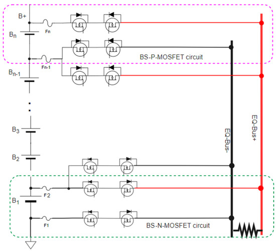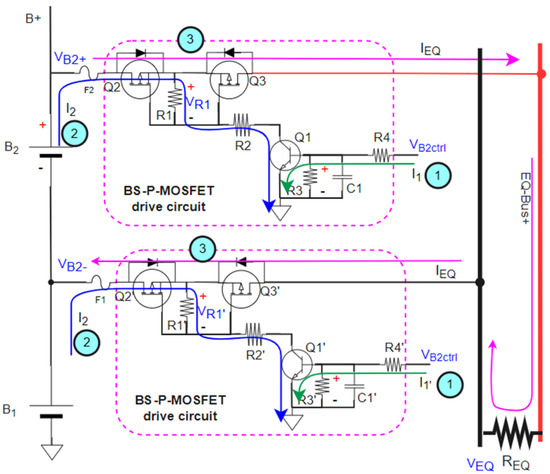Figure 11 can be simplified as Figure 12, where only two cells are series connected. The B1 in Figure 12 corresponds to the battery consisting of B1 to Bn−1 of Figure 11. The B2 in Figure 12 corresponds to the Bn of Figure 11. We use Figure 12 to demonstrate the principle of a BS-P-MOSFET driving circuit with a B2+ path to the EQ-Bus+ because the circuit of the B2− path to the EQ-Bus- is the same structure. Therefore, we only use B2+ to demonstrate the operation principle.