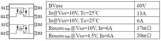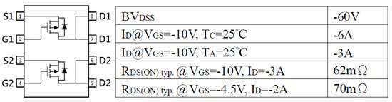 The transistor Q1 uses the BC846, and the Q2 and Q3 use a dual P-MOSFET (MTB60B06Q8) in SOP8 package for size reduction, whose basic specification is shown in Figure 13 and Figure 14 shows the implementation of the BS-P-MOSFET drive circuit.