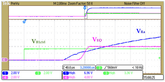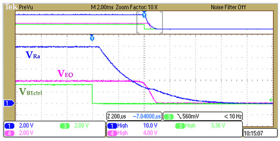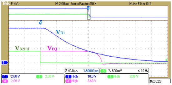 Based on the operation principle of Figure 12, the settings are defined as B1 = 42 V (corresponding to the B1~Bn-1 string of the battery pack) and B2 = 4 V (corresponding to the Bn). Other settings are R1 = 20 kΩ, C1 = 10 nF, R2 = 75 kΩ, R3 = 50 kΩ, and R4 = 50 kΩ. We use the constant resistor mode of electrical load to simulate for obtaining . Therefore, the calculated result is , , and the voltage range of and is 9.2 V (B+ = 46 V) and 8.4 V (B+ = 42 V), respectively. Figure 15 and Figure 16 show the signal of , , and to exhibit the transient state of the switch on and off.