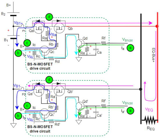 Figure 11 can be simplified as Figure 17, where only two cells are series connected. The B1 in Figure 12 corresponds to the B1 cell of Figure 11. The B2 in Figure 17 corresponds of B2 to Bn of Figure 11. We use Figure 17 to demonstrate the principle of BS-N-MOSFET driving circuit with B1+ path to EQ-Bus+ because the circuit of B1− path to EQ-Bus- is the same structure. Therefore, we only use B1+ to demonstrate the operation principle.