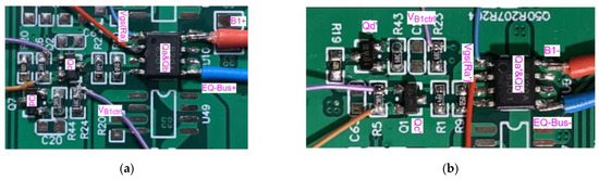 The implementation for BS-N-MOSFET drive circuit verification: (a) BS-N-MOSFET path for B1+ in front of PCB; (b) BS-N-MOSFET path for B1—at the rear of PCB.
