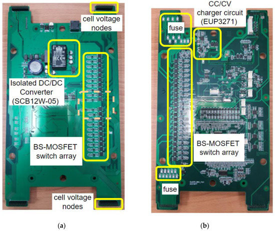The circuit placement of the A-HEC circuit of the BMU board of Figure 22 is shown in Figure 23. The BS-MOSFET could be BS-N-MOSFET or BS-P-MOSFET, the BS-N-MOSFET and BS-P-MOSFET circuit are used to B1–B3 and B4–B22, respectively. We used a commercial product SCW12B-05 (12 W, η = 83%) as the isolated DC/DC converter of Figure 9 to transfer auxiliary input 18–36 V to isolated output 5 V. In Figure 9, the CC/CV charger circuit is implemented by the LIB charger IC (EUP3271) of which the maximum charge current is 4 A.