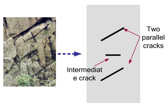 There are various distances and inclination angles between cracks in rocks with joints and cracks. Therefore, a multi-crack model was designed in this study. There are three cracks in the model, among which the upper and lower ones are of equal length and parallel to each other, and the third one is located in the middle of the two cracks and intersects with the two parallel cracks, as shown in Figure 1.