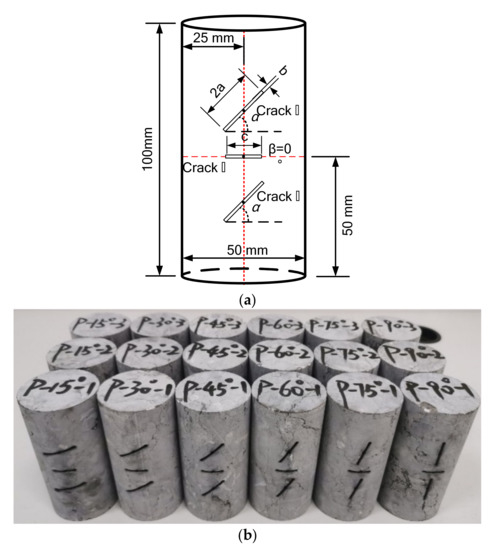 Based on the multi-crack model shown in Figure 1, limestone was selected as the test material, which was fabricated by Jingcheng Geotechnical Service Department in Liuyang, China. The limestone specimen was a cylinder with a size of 50 mm × 100 mm (diameter × height), and the nonparallelism and nonperpendicularity of the end faces were both less than 0.02 mm, which meet the basic requirements of ISRM (International Society for Rock Mechanics). Three cracks were prefabricated on the limestone specimen, including two parallel cracks and one intermediate crack, all of which were cut by water jets. In the two parallel cracks, the upper crack is crack ① and the lower crack is crack ②, both of which are 2a in length (a = 10 mm) and b in width (b = 1.2 mm). The distance D between the midpoints of cracks ① and ② is a fixed value of 33 mm, and the angles between them and the horizontal direction are both α. α changes from 15° to 90°, with an increment of 15°. The middle crack is crack ③, where the midpoint is located in the specimen center; it has a length of c (c = 13 mm) and a width of b (b = 1.2 mm). The angle between the middle crack and the horizontal direction is β, and β is always 0°. It is worth noting that the midpoints of the parallel cracks and the intermediate crack are all on the central axis of the specimens. Figure 2 shows the information of all the specimens, and Table 1 shows the specimen schemes. In the uniaxial compression test, displacement loading was selected for loading at a loading rate of 0.12 mm/min. Meanwhile, a digital speckle system was set-up to monitor the strain field on the specimens’ surface, as shown in Figure 3. To reduce the discreteness of the test, three specimens were taken for each test group.