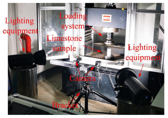 In addition to the above observation methods, some scholars have also used digital image correlation technology (DIC technology) to study rock failure processes. DIC was first proposed by Japanese scholar Yamaguchi I [23] and American scholar Ranson et al. [24]. Later, Sutton et al. [25,26,27] improved the theories related to digital image technology and applied this method to study the variation in the displacement field in the crack propagation process. Some scholars [28,29,30,31,32] have used glass fiber-reinforced polymers to replace steel to avoid performance degradation caused by steel corrosion. In order to improve the real-time monitoring effect of the structure, a conductive cement composite material was developed using artificial intelligence. Zhao et al. [33,34] used digital image correlation technology to study the entire process of crack initiation, propagation, and penetration failure of sandstone specimens, and analyzed the changes in strain field during specimen failure. Song et al. [35] calculated and analyzed the displacement evolution of the deformation localization zone and the energy evolution of a specimen’s surface deformation during the loading of rock specimens through the digital speckle correlation method. Zhao et al. [36], Zhu et al. [37], and Guo et al. [38] obtained the principal strain field of a defective rock’s surface under uniaxial action through digital image correlation technology and analyzed the entire process of crack initiation, propagation, and failure by using the linear strain theory of maximum elongation. Ma et al. [39] conducted uniaxial compression tests on slab granite specimens with prefabricated circular holes, and used 3D-DIC technology to observe and calculate the displacement field and strain field on the surface of the specimen during the failure process. The calculated results better reflect the whole process of crack generation, propagation. and coalescence on the surface of the sample. It proves that 3D-DIC technology has its unique advantages in rock and soil mechanics tests. Li et al. [40] calculated the principal strain nephogram and the shear strain nephogram on the surface of rock specimens with trigeminal cracks through digital image correlation technology and found that specimen failure was caused by tensile failure rather than shear failure. Peng et al. [41] studied the entire uniaxial compression failure process of prefabricated porous marble by using a three-dimensional digital image observation system and analyzed the evolution process of the surface displacement field and strain field of prefabricated porous marble during the failure process.