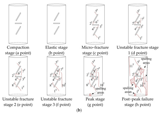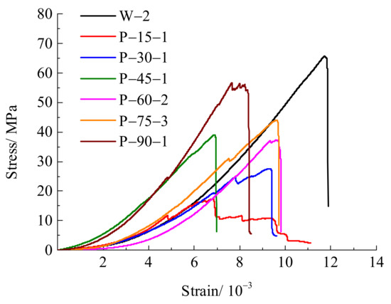 Under uniaxial compression, the peak strength of the limestone specimens with cracks is lower than that of the specimens without cracks (Figure 5). Specimen P−15−1 shows a “stepped” drop in stress after the peak value, which is mainly caused by unstable crack growth, and it is a typical post–peak stress softening phenomenon [43].