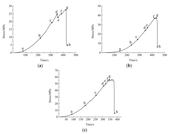 The uniaxial compression process of a rock can be divided into six stages: compaction stage, elastic stage, micro-fracture stage, unstable fracture stage, peak stage, and post–peak failure stage [44]. To facilitate the observation and study of the crack initiation, propagation, and coalescence processes, the stress–time curves for specimens P−30−1, P−60−2, and P−90−1 were plotted. Then, the characteristic points (a, b, c, d, e, f, g, h) on the stress–time curves were taken under each compression stage, in which one point each was taken at the compression stage, elastic stage, and micro-fracture stage and denoted as points a, b, and c. As there were many new cracks in the unstable fracture stage, three points were taken at this stage and recorded as point d, point e, and point f. A point each was taken at the peak and post-peak stages and denoted as point g and h, respectively, as shown in Figure 6.