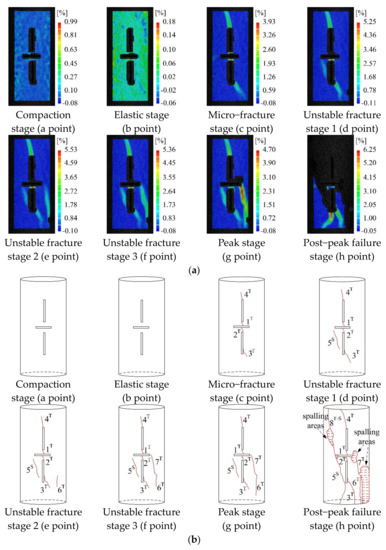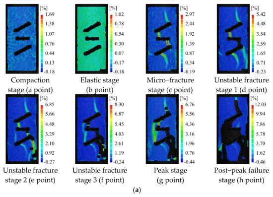 As shown in Figure 9, the principal strain nephogram for the limestone specimen with parallel cracks of 90° in the compaction and elastic stages is consistent with those of the above two groups of specimens; there is no strain concentration and no crack appears on the specimen’s surface. Under uniaxial compression, strain concentration areas appear between crack ① and crack ③, between crack ② and crack ③, at the lower right of the lower end of crack ②, and above the upper end of crack ① when the specimen enters the micro-fracture stage. The maximum strain values in these areas are 0.039, 0.033, 0.019, and 0.022, respectively, which all exceed the critical line strain. It is considered that wing cracks 1T, 2T, 3T, and 4T occur in these areas. When the specimen enters the unstable fracture stage 1 under uniaxial compression, a sloping strain concentration area appears on the left side of crack ②, with a maximum strain value of 0.012, where the generated crack is shear crack 5S. In the unstable fracture stage 2, a strain concentration area appears on the right side of crack ②, with a maximum strain value of 0.018, where tensile crack 6T forms. In the unstable fracture stage 3, the strain concentration area where tensile crack 6T is located extends toward the left end of crack ③ and the maximum strain value changes from 0.019 to 0.023. Tensile crack 7T appears here and is connected with the upper end of the previously generated tensile crack 6T and the left end of crack ③. At the peak stage, no new cracks occur, but the previously generated cracks all propagate slightly. In the post-peak failure stage, the cracks on the specimen propagate relatively rapidly and a lot of spalling areas appear. Wing cracks 3T and 4T and shear crack 5S rapidly penetrate through both ends of the specimen along their respective propagation directions. At the same time, a tensile-shear composite crack 8T-S is produced, which connects the left end of crack ③ to the specimen’s top.