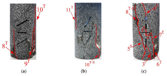 When the parallel crack inclination angle is 30°, a coalescence occurs between the left end of crack ① and the left end of crack ②, and the coalescing crack is a tensile-shear crack called 7T-S. There is coalescence between the left end of crack ① and the left end of crack ③, and the coalescing crack is wing crack (tensile crack) 2T. There are two coalescences between the two ends of crack ② and crack ③, and the coalescing cracks are tensile cracks 1T and 6T, respectively (Figure 10). When the parallel crack inclination angle is 60°, a coalescence occurs between the left end of crack ① and the left end of crack ③, and the coalescing crack is wing crack 2T. There is coalescence between the right end of crack ② and the right end of crack ③, and the coalescing crack is wing crack 3T. When the parallel crack inclination angle is 90°, the lower end of crack ① and the upper end of crack ② coalesce with the middle part of crack ③ at two respective locations, and the coalescing cracks are wing cracks 1T and 2T, respectively.
