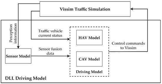 Figure 1, which consists of three models. Considering that the traffic participants in Vissim cannot individually set up a sensor model to perceive the surrounding obstacles, DLL provides a possibility to obtain specific parameters of the surrounding vehicles (e.g., relative distance and velocity, heading angle, etc.) passed from Vissim. As a consequence, this perception information is gathered in the sensor model then sent to the driving model (HAV and CAV) as input. In parallel, driving models receive sensor fusion data and current vehicle dynamics data from Vissim to calculate lateral and longitudinal control commands, which are fed back to Vissim and the movement of the traffic vehicle is completed in the loop. The three models are described in more detail in the following subsections.