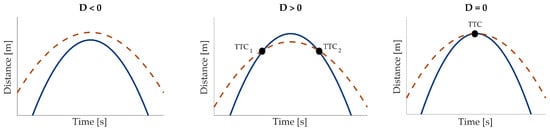 TTC is used to determine the time difference between the current time to a future moment when a potential crash will happen. It is a snapshot of the currently prevailing conditions and is only valid if the conditions stay stable. Nevertheless, it is useful for the prediction of potential crashes and for classifying the time-based safety distance to other traffic participants. The calculation of the TTC starts with the position of a car in dependency of the driving velocity, and the acceleration is described by Equation (