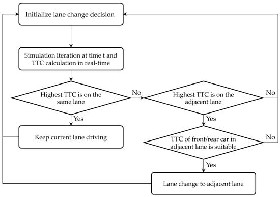 Figure 3 illustrates a decision-making process to decide lane change direction. These commands will be as an internal signal transmitted to the driving function model. Before the vehicle reaches cruising speed, if the TTC detected in the same lane is highest, it means the target vehicle is far enough away to be safe. Therefore, the ego car can continue to drive on the current lane unless the adjacent lane TTC is higher and the lane change condition is satisfied; in this case, the sensor model will send a lane change decision signal to the driving model. Even during the lane change execution, the sensor model continues the TTC calculation between the surrounding cars in simulation iteration and the ego car in order to change the lane change decision at any time.