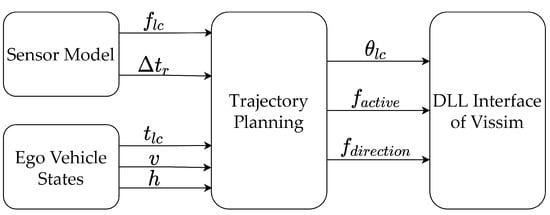provided by the sensor model. In the end, TPB converts the inputs to the heading angle of the vehicle, lane change active command and lane change direction. These signals are transmitted to the DLL interface to control the Vissim traffic vehicles until lane change action is finished. Therefore, lane change trajectory and the back-planning trajectory generation in TPB are described as two important functions in the following: