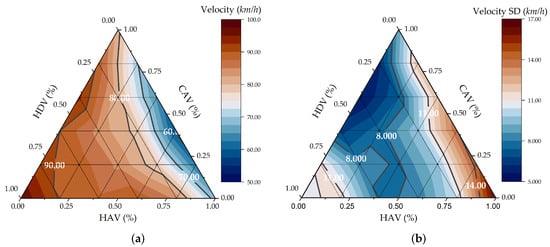 Figure 10a was drawn in ternary plots. It graphically depicts the penetration rate of the three vehicle models from 0% to 100% as the three sides in an equilateral triangle. The color inside the triangle indicates the average speeds over the network. At every point within the triangle, the ratio of each combination is inversely proportional to the distance from the corner. Combining
