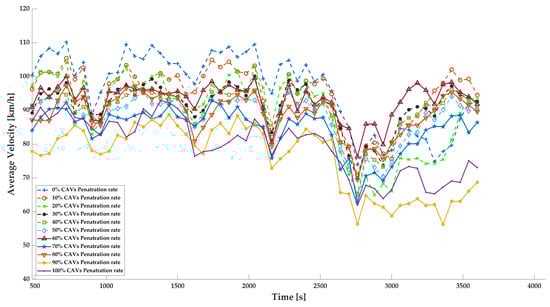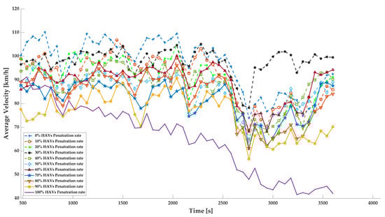 Although the introduction of CAV individually also has a negative impact on the road network performance, due to the connection and cooperation functionality of CAV, the distribution of average speed is more concentrated than that of HAV. In the later stages of the simulation, as the penetration rate of CAV in the network increases, they can make full use of their connectivity to travel with small gaps, change lane faster, and absorb shock wave. Focusing on speed change, we see that under a high CAV penetration rate, the speed of the network shows a continuous growth tendency.