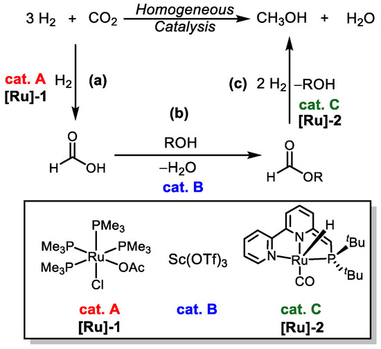 - Huff, C.A.; Sanford, M.S. Cascade Catalysis for the Homogeneous Hydrogenation of CO2 to Methanol. J. Am. Chem. Soc. 2011, 133, 18122–18125. [Google Scholar] [CrossRef] [PubMed]