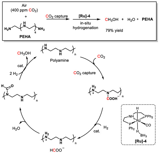 - Yoshimura, A.; Watari, R.; Kuwata, S.; Kayaki, Y. Poly(ethyleneimine)-Mediated Consecutive Hydrogenation of Carbon Dioxide to Methanol with Ru Catalysts. Eur. J. Inorg. Chem. 2019, 2019, 2375–2380. [Google Scholar] [CrossRef]