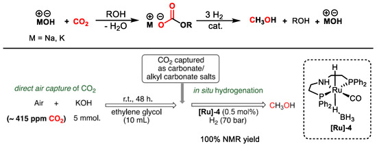 - Ashley, A.E.; Thompson, A.L.; O’Hare, D. Non-Metal-Mediated Homogeneous Hydrogenation of CO2 to CH3OH. Angew. Chem. Int. Ed. 2009, 48, 9839–9843. [Google Scholar] [CrossRef] [Green Version]